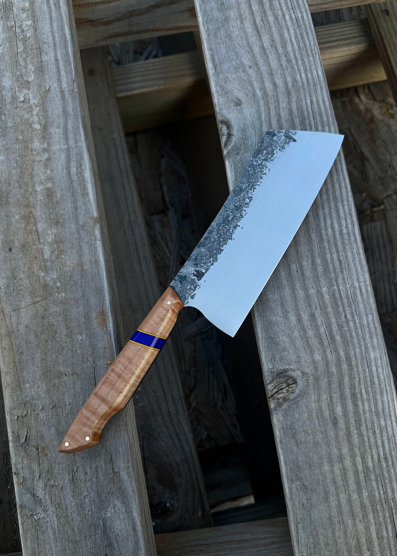 A variation of a santoku’s geometry, this general purpose kitchen knife is great for vegetables, fish, and herbs. A great general purpose blade with a different feel. A longer handle for more variety in grip. A slight taper from the spine to the belly allows for more secure control.